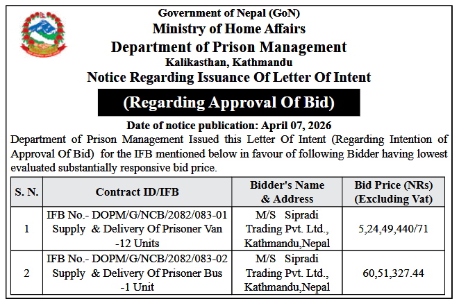 Prison Van तथार Bus को आर्थिक प्रस्ताव खोल्खे सम्बन्धी सूचना